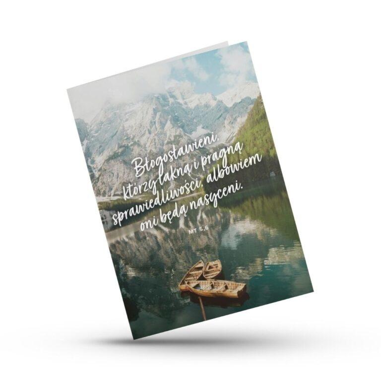 Kartka z cytatem z Ewangelii Mateusza 5,6 przypomina o Bożej obietnicy dla tych, którzy pragną dobra i prawdy.