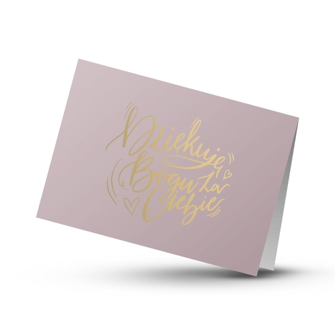 Delikatna, pełna wdzięczności kartka z napisem "Dziękuję Bogu za Ciebie", wykonanym techniką złocenia (hot-stamping).