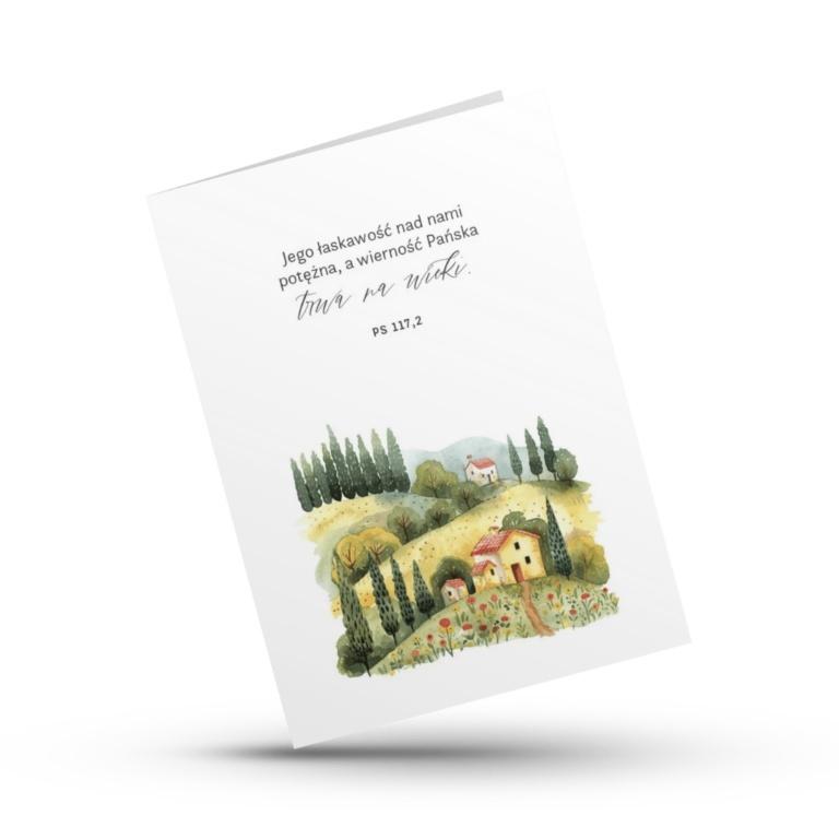 Kartka z cytatem z Psalmu 117,2 to subtelne przypomnienie o Bożej miłości i niezmiennej wierności, które trwają na wieki. Urocza akwarela przedstawiaja sielankowy krajobraz z domkiem pośród zielonych wzgórz i cyprysów.