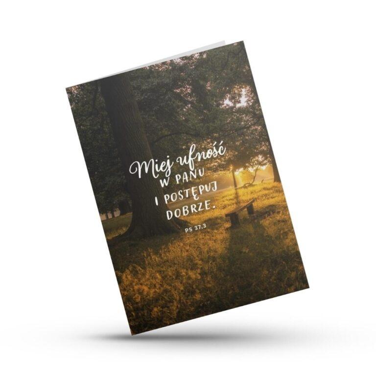 Ta wersja kartki z cytatem z Psalmu 37,3 zachwyca ciepłą kolorystyką zachodu słońca i naturalnym krajobrazem. Przypomina o zaufaniu Bogu idealna na każdą okazję.
