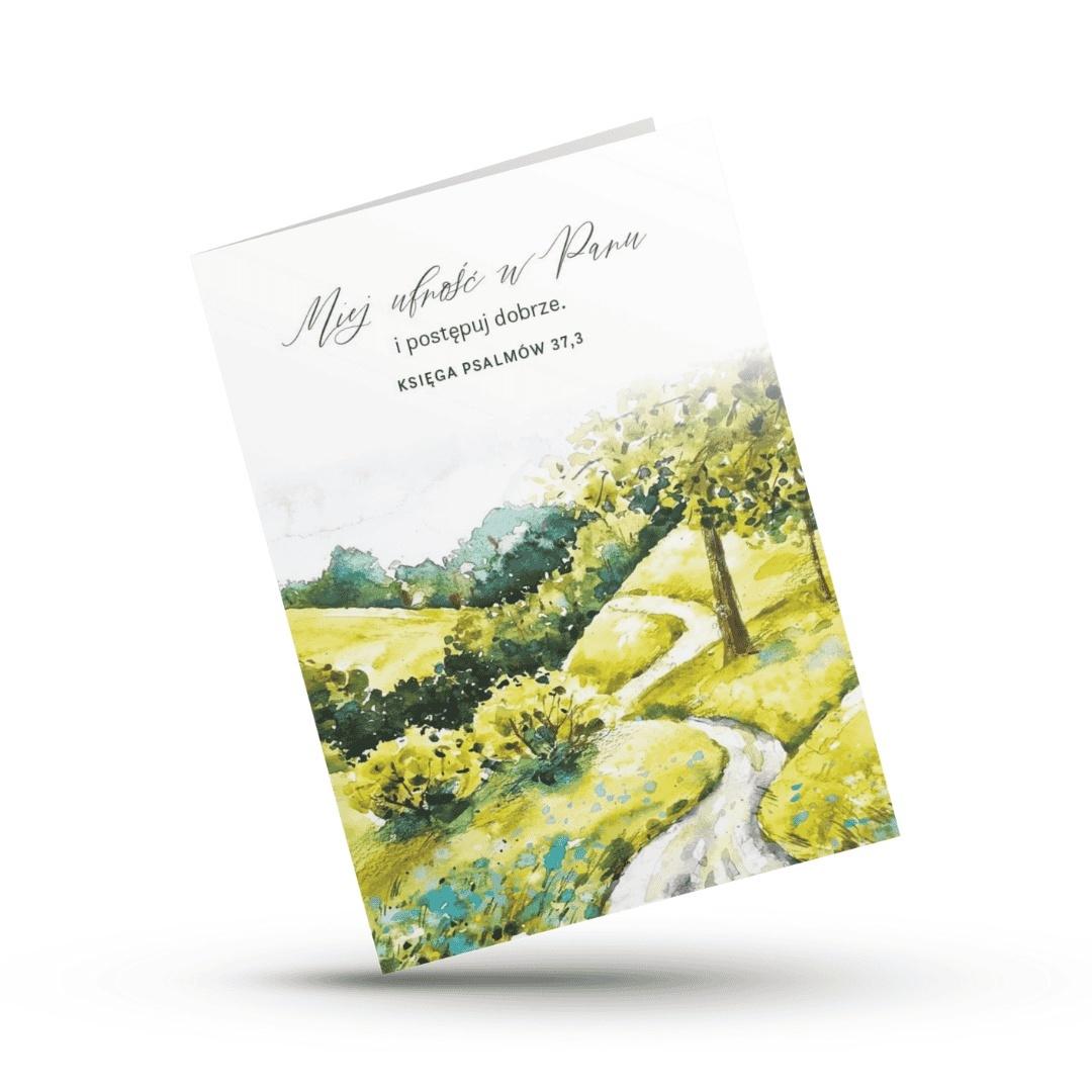 Kartka z cytatem z Księgi Psalmów 37,3 to subtelne przypomnienie o zaufaniu Bogu i czynieniu dobra na co dzień. Na kartce znajduje się delikatny, akwarelowy pejzaż w odcieniach zieleni i żółci.