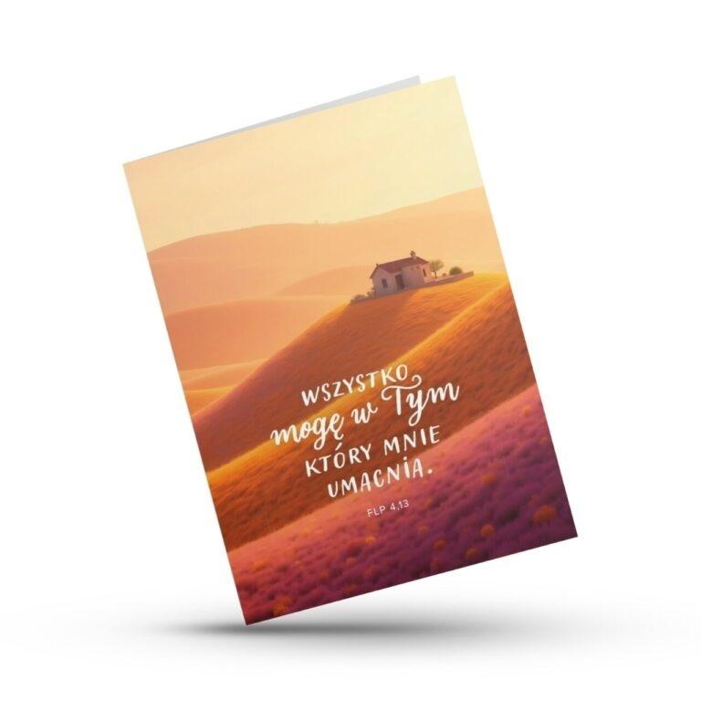 Kartka z cytatem z Listu do Filipian 4,13 to przesłanie pełne siły i nadziei przypomnienie, że z Bogiem możliwe jest wszystko. To doskonała kartka z życzeniami wsparcia, motywacji lub błogosławieństwa.