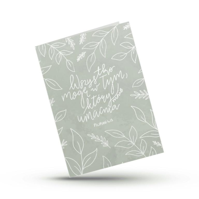 Kartka z przesłaniem siły, nadziei i zaufania Bogu. Jej subtelny, oliwkowo-zielony kolor i delikatny roślinny motyw w połączeniu z kaligrafią tworzą harmonijny i elegancki projekt. Słowa z Listu do Filipian 4,13 przypominają, że prawdziwa moc pochodzi od Boga i w Nim można odnaleźć odwagę do każdego wyzwania.