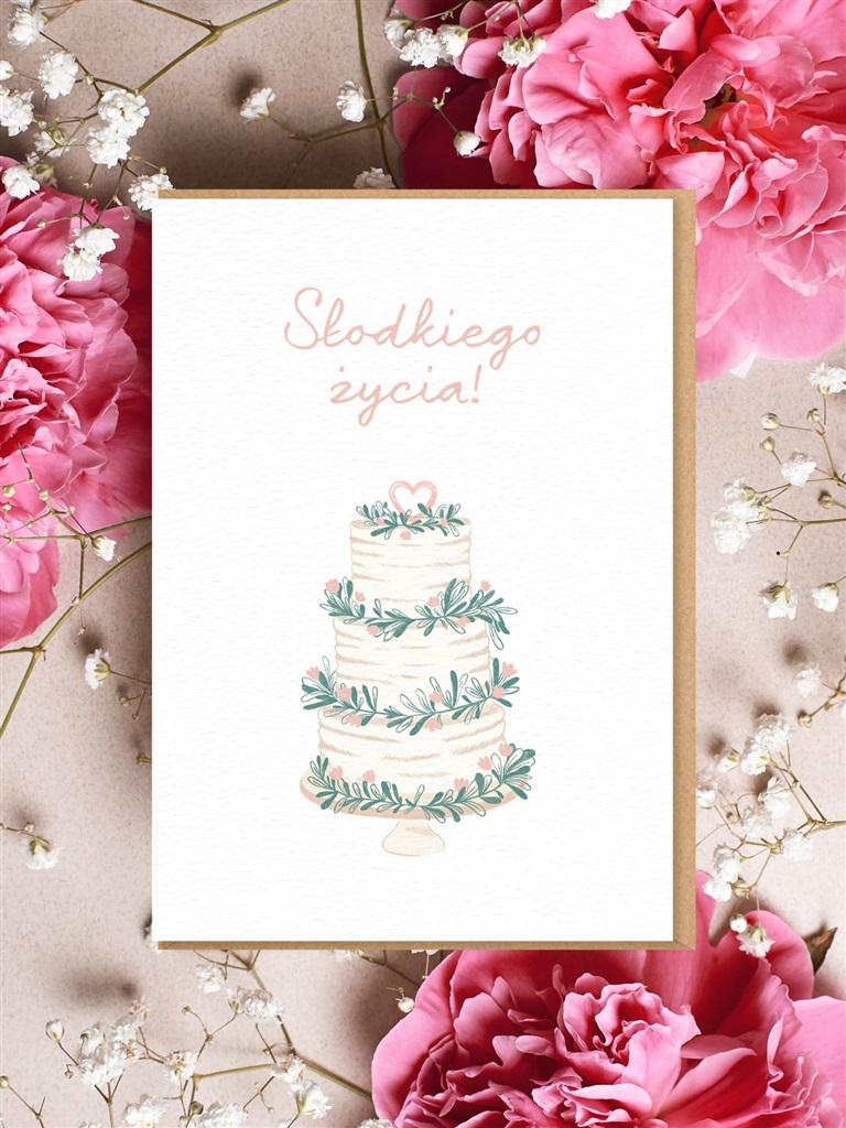 Miłość jest największą osłodą życia, dlatego jako prezent z okazji ślubu stawiamy na słodycze zamiast kwiatów! No chyba że te o słodkim zapachu Kartka ślubna SŁODKIEGO ŻYCIA! to wyjątkowy pomysł na prezent dla nowożeńców! Ta oryginalna kartka okolicznościowa z motywem tortu weselnego idealnie sprawdzi się w duecie ze słodkim podarunkiem. Taki prezent ślubny z pewnością doceni każdy zakochany łasuch. Kartka ślubna SŁODKIEGO ŻYCIA! została stworzona od A do Ż w Polsce z miłości do piękna polszczyzny. Podaruj ją najsłodszej parze, jaką znasz! Niech już zawsze karmi się swoją miłością. Kartka ślubna SŁODKIEGO ŻYCIA! Wymiary kartki (po złożeniu): 12 cm x 17 cm Gramatura papieru: 250 g/m2 W zestawie elegancka koperta z eko kraftu Wymiary koperty: 12,5 cm x 17,5 cm Gramatura koperty: 100 g/m2 Zestaw zapakowany w folię Idealna kartka okolicznościowa dla nowożeńców Wyprodukowano w Polsce