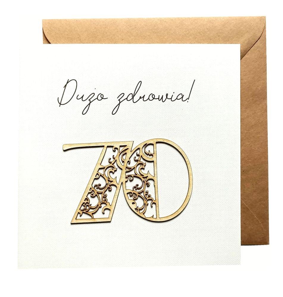 Kartka okolicznościowa z okazji urodzin o treści: Tego wyjątkowego dnia, kiedy obchodzisz swoje 70 urodziny śpieszę życzyć Ci wszelkiej pomyślności, nadziei w sercu, promiennego uśmiechu na ustach, trafnych zrządzeń losu, wielu niezapomnianych wrażeń, morza radości, spełnienia marzeń oraz bezkresnej, prawdziwej miłości.