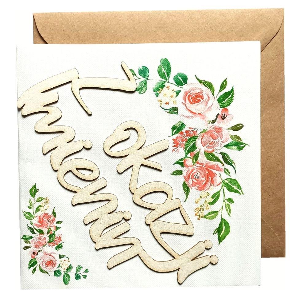 Kartka okolicznościowa z okazji imienin o treści: Twoje imię w kalendarzu to jest Twój szczęśliwy dzień. Poczta kwiatów w korytarzu już za chwilę spotka Cię! Życzeń pęki weź do serca i uśmiechaj często się? Smutków niech Ci nikt nie wkręca dziś są imieniny Twe!