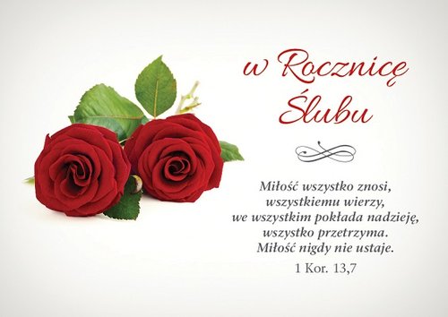 Kartka składana z kopertą. W ROCZNICĘ ŚLUBU Miłość wszystko znosi, wszystkiemu wierzy, we wszystkim pokłada nadzieję, wszystko przetrzyma. Miłość nigdy nie ustaje. 1 Kor. 13,7