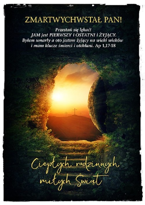 Kartka składana z kopertą. ZMARTWYCHWSTAŁ PAN! Przestań się lękać! JAM jest PIERWSZY i OSTATNI i ŻYJĄCY. Byłem umarły a oto jestem żyjący na wieki wieków i mam klucze śmierci i otchłani. Ap 1,17-18 Ciepłych, rodzinnych, miłych Świąt!