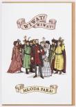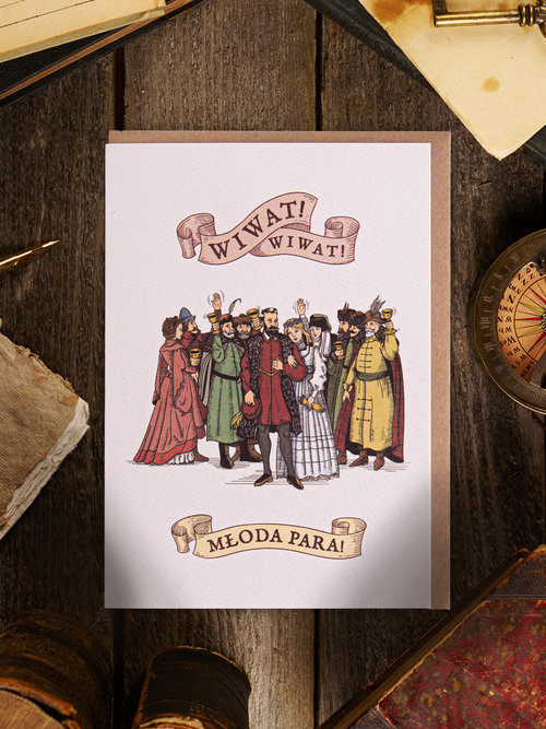 WIWAT, WIWAT MŁODA PARA! – czyli tak się bawi szlachta! Nasza oryginalna kartka ślubna w estetyce retro jest inspirowana obyczajowością sarmacką i literaturą staropolską. Spośród innych kartek dostępnych na rynku wyróżnia się świeżością, a przy tym nawiązuje do tego, jak to drzewiej bywało. Podarowana jako dodatek do prezentu ślubnego dla młodej pary z pewnością zwróci uwagę nowożeńców. Kartka w zestawie z elegancką kopertą jest pusta w środku i została wydrukowana na papierze ekologicznym. Jej wnętrze czeka na wypełnienie treścią płynącą prosto z Twojego serca! WIWAT, WIWAT MŁODA PARA! - kartka dla nowożeńców Wymiary kartki (po złożeniu): 12 cm x 17 cm Gramatura papieru: 250 g/m2 Elegancka koperta z eko kraftu Wymiary koperty: 12,5 cm x 17,5 cm Gramatura koperty: 100 g/m2 Zestaw zapakowany w folię Oryginalna kartka ślubna inspirowana polską kulturą Wyprodukowano w Polsce