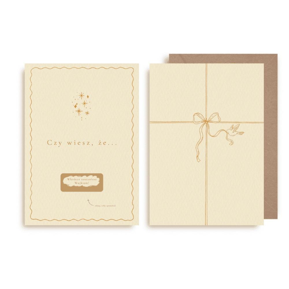 Podziel się cudowną nowiną w wyjątkowy sposób! Kartka zdrapka pozwoli zaskoczyć przyszłego Wujka i dostarczyć mu niezapomnianych emocji. Po zdrapaniu specjalnie oznaczonego miejsca ukaże się radosna wiadomość.