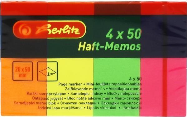 Kartki samoprzylepne, format 20 x 50mm, 4 osobne paski o wymiarach 4x50 szt., w intensywnych kolorach.