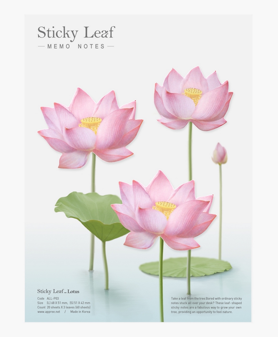 Karteczki samoprzylepne indeksujące w kształcie kwiatów lotosu. Każdy listek papieru jest samoprzylepny — dzięki temu znajdzie zastosowanie jako klasyczna kartka do notatek oraz jako zakładka indeksująca. Wykorzystasz je w domu, biurze, w planerach, książkach. W fantastyczny i kreatywny sposób można je również wykorzystać do scrappbookingu oraz bullet journalingu. Arkusz zawiera 3 x 20 szt. kartek. Wymiary karteczek: 68x51 mm i 51x42 mm. Appree to koreańska marka produkująca akcesoria papiernicze inspirowane naturą. Każdy produkt jest najwyższej jakości, estetyczny, wykonany z dbałością o detale.