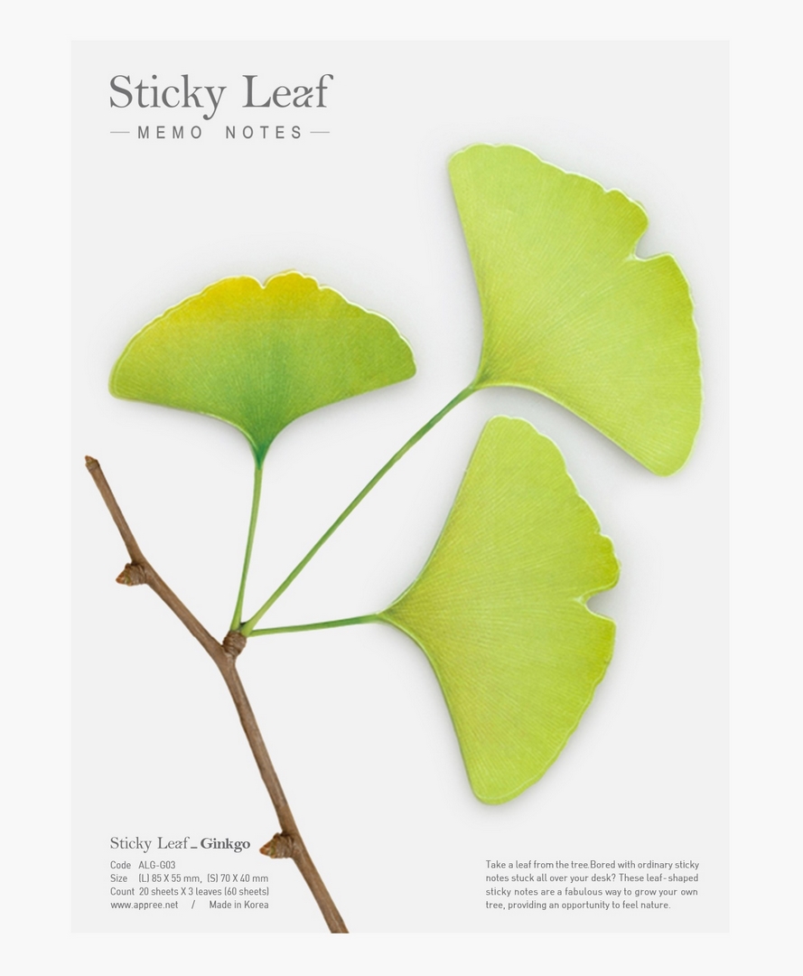 Karteczki samoprzylepne indeksujące w kształcie liści miłorzębu. Każdy listek papieru jest samoprzylepny, dzięki temu znajdzie zastosowanie jako klasyczna kartka do notatek oraz jako zakładka indeksująca. Wykorzystasz je w domu, biurze, w planerach, książkach. W fantastyczny i kreatywny sposób można je również wykorzystać do scrappbookingu oraz bullet journalingu.