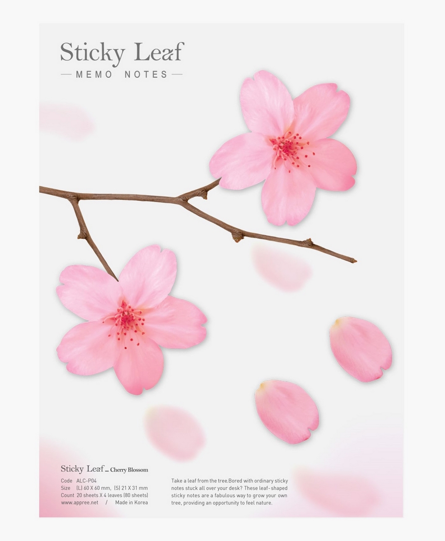 Karteczki samoprzylepne indeksujące w kształcie kwiatów wiśni. Każdy listek papieru jest samoprzylepny — dzięki temu znajdzie zastosowanie jako klasyczna kartka do notatek oraz jako zakładka indeksująca. Wykorzystasz je w domu, biurze, w planerach, książkach. W fantastyczny i kreatywny sposób można je również wykorzystać do scrappbookingu oraz bullet journalingu. Arkusz zawiera 4 x 20 szt. kartek. Wymiary karteczek: 60x60 mm i 21x31mm. Appree to koreańska marka produkująca akcesoria papiernicze inspirowane naturą. Każdy produkt jest najwyższej jakości, estetyczny, wykonany z dbałością o detale.