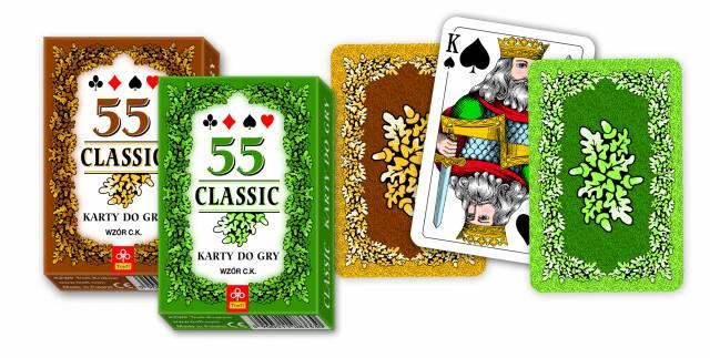 Karty Classic to wzór znany w Polsce od dziesięcioleci. Charakterystyczne bursztynowe i zielone rewersy ozdobione są liśćmi dębu, a figury i kolory oznaczone międzynarodowym wzorem. Karty są odpowiednie do wszystkich rodzajów klasycznych gier karcianych. Talia dla graczy lubiących klasykę w tradycyjnym wydaniu. Talia zawiera 55 listków karcianych