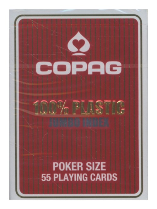 Czerwone karty Copag Jumbo Index są wykonane w 100% z plastiku, można je łatwo zgiąć i obrócić w kształt kolby, można je łatwo zwinąć po filcu stołu do pokera i łatwo je wyczyścić w przypadku zatkania. Kolejną zaletą tej talii wśród świetnych indeksów jest wygląd kart, dzięki czemu możesz łatwo zobaczyć, jakie karty masz w rękach i po prostu śledzić rozwój sytuacji na stole do gry.