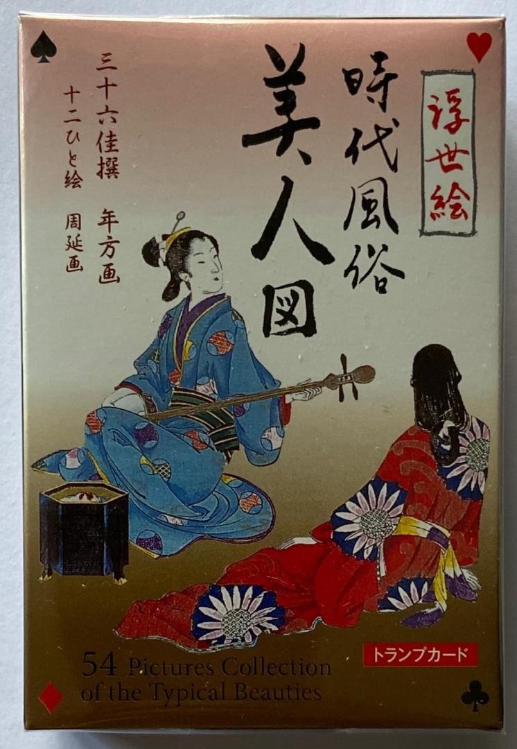 Elegancki japoński zestaw kart do gry premium z piękną, artystyczną ilustracją. Zestaw zawiera 54 karty inspirowanych klasycznym japońskim drzeworytem. Przedstawiony wzór ukazuje eleganckie kobiety w pięknych kimonach w stylu ukiyo-e subtelną i pełną gracji scenę z serii Beauties of the Era. Klasyczny format kart, eleganckie japońskie napisy i tradycyjna kolorystyka.