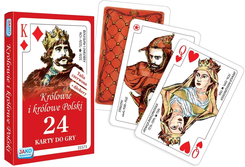 Talia składa się z 24 kart oraz dodatkowo z 2 kart dżokerów. Zdobiona jest autorskimi rysunkami królów i królowych Polski oraz Stańczyka. Karty są zapakowane w kartonowe pudełko. Cechują się wysoką jakością wykonania. Idealnie nadają się na prezent. Rozmiar kart: 58 x 88 mm. Wykaz postaci: - Bolesław I Chrobry 967-1025; koronacja 1025 - Bolesław II Szczodry (Śmiały) 1041/1042-1081/1082; koronacja 1076 - Władysław I Łokietek 1260/1261-1333; koronacja 1320 - Jadwiga Bolesławówna ok. 1266/1275-1339; koronacja 1320 - Kazimierz III Wielki 1310-1370; koronacja 1333 - Jadwiga Andegaweńska 1374-1399; koronacja 1384 - Władysław II Jagiełło 1352/1362-1434; koronacja 1386 - Kazimierz IV Jagiellończyk 1427-1492; koronacja 1447 - Elżbieta Rakuszanka 1436/1437-1505; koronacja 1454 - Zygmunt I Stary 1467-1548; koronacja 1507 - Bona Sforza 1494-1557; koronacja 1518 - Zygmunt II August 1520-1572; koronacja 1530 - Stańczyk około 1480-1560 (dżoker)