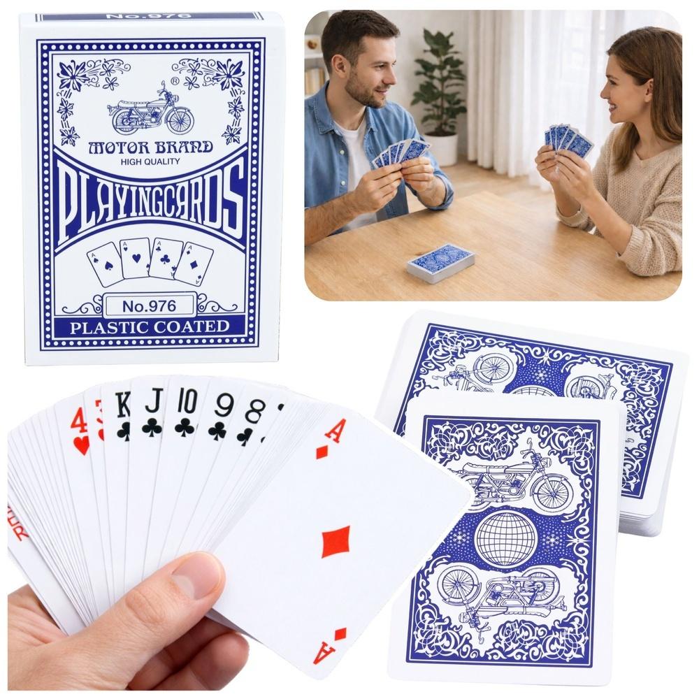 Karty zostały pokryte plastikową powłoką, co zwiększa ich trwałość oraz odporność na zginanie i zabrudzenia. Dzięki temu są bardziej wytrzymałe niż standardowe papierowe talie i zachowują estetyczny wygląd przez długi czas użytkowania. Gładka powierzchnia ułatwia tasowanie oraz rozdawanie kart.