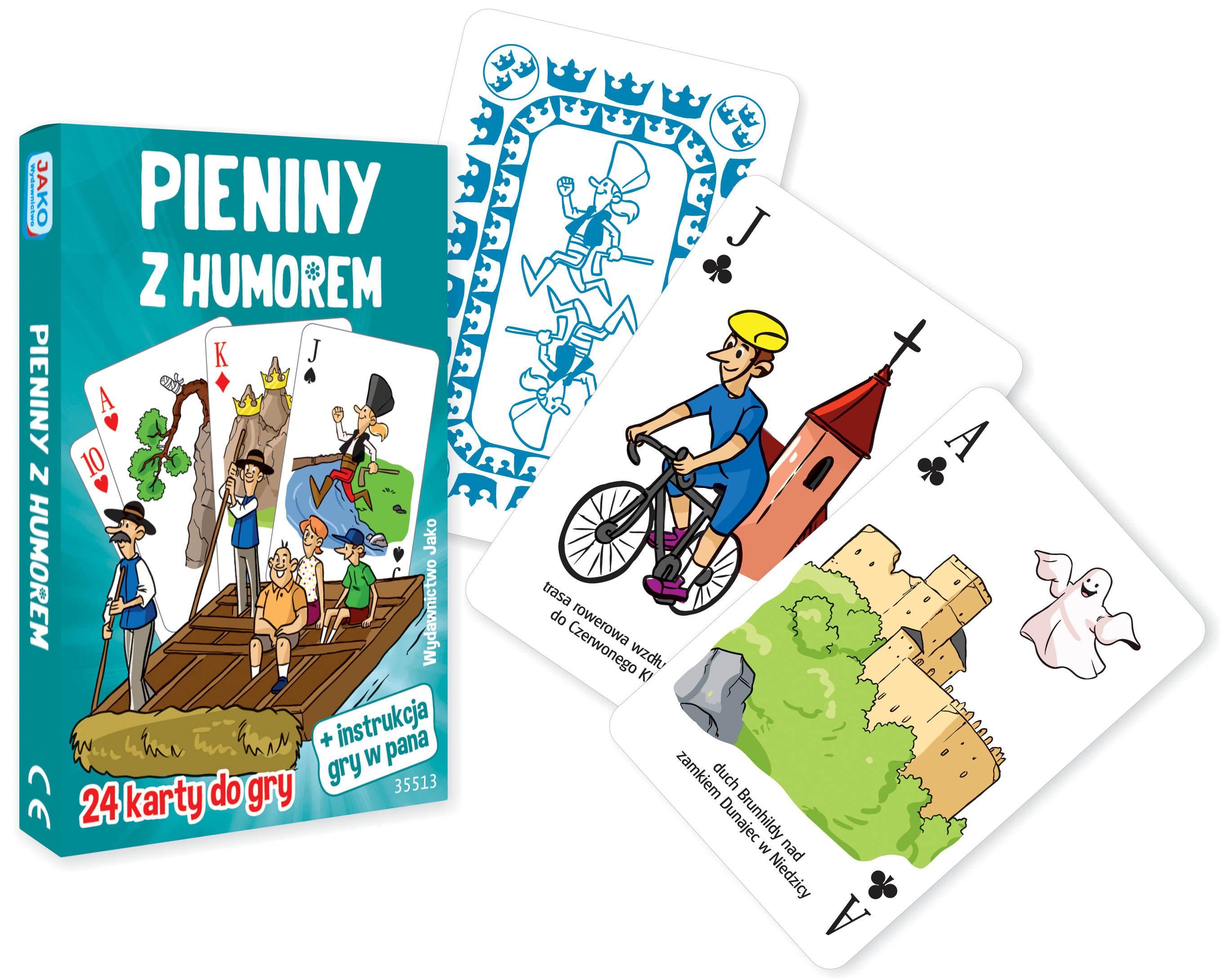 Karty do gry "Pieniny z humorem" są ilustrowane wesołymi obrazkami inspirowanymi tymi malowniczymi górami. Grafiki przedstawiają szczyty, obiekty, symbole i postacie charakterystyczne dla tego regionu.