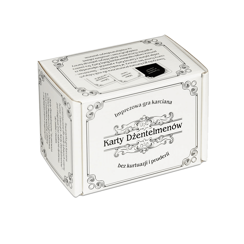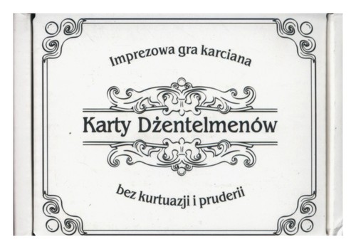 Karty Dżentelmenów to imprezowa gra towarzyska bez kurtuazji i pruderii, za to z ogromną dawką czarnego humoru. Dżentelmeńskie rozgrywki z pewnością urozmaicą każde spotkanie w gronie błyskotliwych i obdarzonych niebywałym poczuciem humoru osób. Nie powinno jej zabraknąć na Twojej imprezie. Produkt posiada przejrzyste zasady, co zachęci każdego do gry i pozwoli szybko wczuć się w atmosferę pełną czarnego humoru. Grą kieruje prosta mechanika: w każdej kolejce – Dżentelmen – zadaje pytanie z Czarnej Karty, a pozostali odpowiadają za pomocą swojej najzabawniejszej Białej Karty. Drugim sposobem wykorzystania gry Karty Dżentelmenów jest tworzenie z jej pomocą opowieści pełnych czarnego humoru bez cenzury. Podczas gry w Dżentelmeńskie Opowieści wszyscy gracze wspólnie tworzą absurdalne i wciągające historie w oparciu o frazy z Białych Kart. Pozwólcie się zaskoczyć efektami Waszej kreatywności! Gra Karty Dżentelmenów dzięki eleganckiej oprawie nadaje się na wyszukany i na pewno trafiony prezent. Jako jedyna na polskim rynku gra karciana zawiera anglojęzyczne odpowiedniki pytań i odpowiedzi, dzięki którym pokonuje bariery międzykulturowe i umożliwia zabawę na międzynarodowym poziomie. Kieszonkowe pudełko wersji podstawowej zawiera 220 plastikowanych kart na profesjonalnym papierze karcianym z wkładką węglową, a w tym: 53 Czarne Karty pytań 159 Białe Karty odpowiedzi 4 puste Białe Karty na Twoją odpowiedź 4 karty instrukcji Wiek graczy: 18+ Liczba graczy: 3-15 Czas rozgrywki: 30 minut