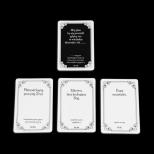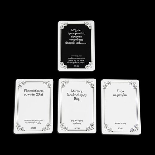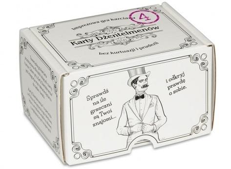 Czwarta edycja gry imprezowej dla miłośników czarnego humoru Pocałuj prababcię w czoło i wyłącz aparaturę podtrzymującą życie! :) Karty Dżentelmenów: Epizod Czwarty to towarzyska gra karciana przeznaczona dla osób lubiących czarny humor bez cenzury! W każdej kolejce Dżentelmen zadaje pytanie z Czarnej Karty, a pozostali odpowiadają za pomocą swojej najzabawniejszej Białej Karty. To pierwsza w Polsce dwujęzyczna gra tekstowa tego typu, która umożliwia wspólną zabawę z anglojęzycznymi znajomymi! Karty Dżentelmenów: Epizod Czwarty to imprezowa gra dla 3 do 15 dorosłych graczy, którzy muszą wyzbyć się kurtuazji i pruderii. Sprawdź na ile grzeczni są Twoi znajomi! Pudełko zawiera 220 kart w tym: 50 nowych Czarnych Kart pytań 155 nowych Białych Kart odpowiedzi 15 pustych (5 Czarnych i 10 Białych) kart na Twoje pomysły Pełna kompatybilność z pozostałymi częściami