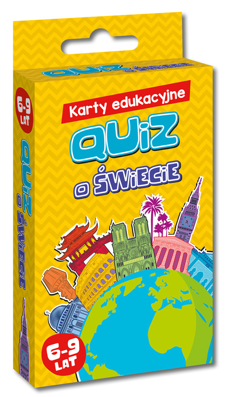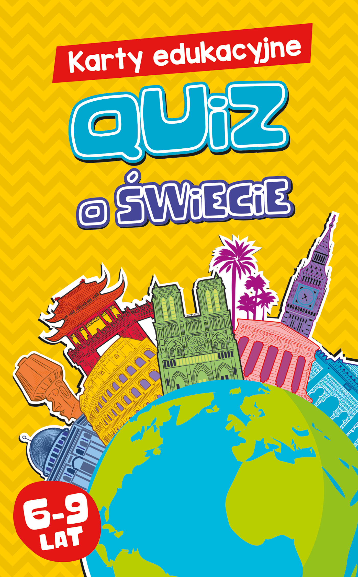 Zaskakujące fakty i pytania quizowe! Karty edukacyjne Quiz o świecie przeznaczone są dla dzieci w wieku 6-9 lat. Na 55 dwustronnych, ilustrowanych kartach znajdują się fascynujące informacje o krajach, kontynentach i ich mieszkańcach oraz ponad 100 pytań w formie quizu.
