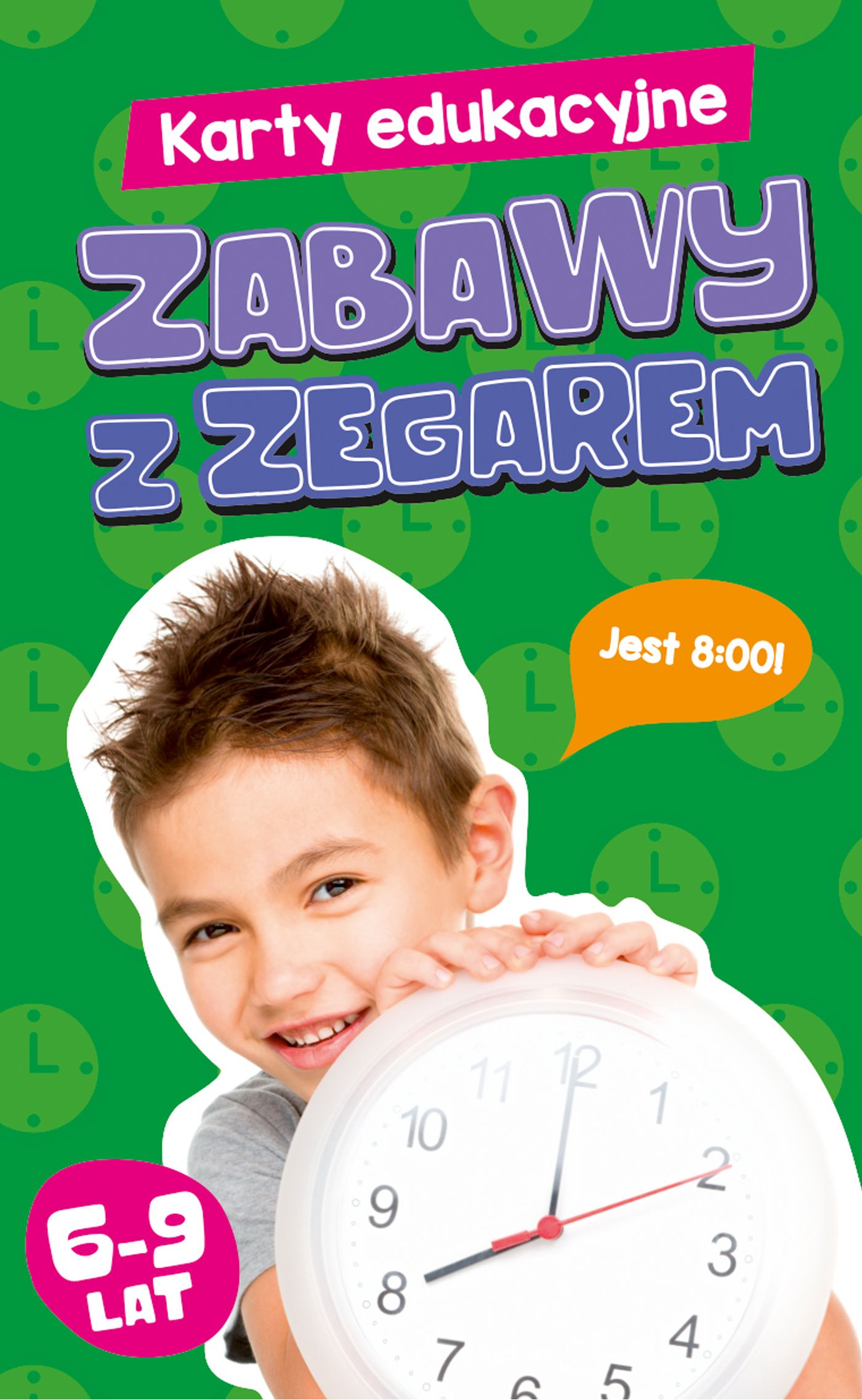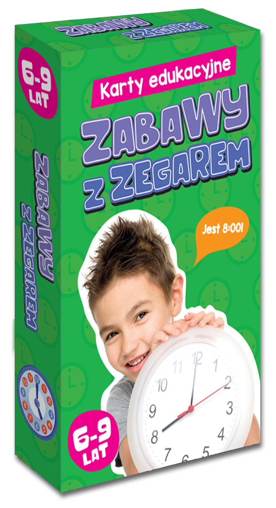 Karty edukacyjne. Zabawy z zegarem zostaly przygotowane z myślą o dzieciach w wieku 6-9 lat. Dzięki różnorodnym wariantom rozgrywek uczniowie uczą się poprawnego rozpoznawania godzin zarówno analogowych (umieszczone na awersach), jak i cyfrowych (znajdujące się na odwrocie kart).