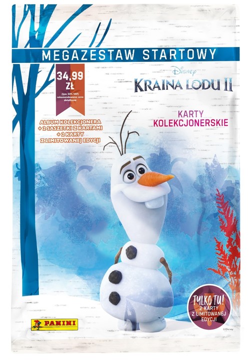 Kolekcja kart Panini związana z fabułą drugiej części popularnego filmu dla dzieci Kraina Lodu II. Megazestaw startowy oprócz albumu umożliwiającego przechowywanie kart zawiera również 2 saszetki oraz 2 karty z limitowanej edycji, co daje łącznie 14 kart.