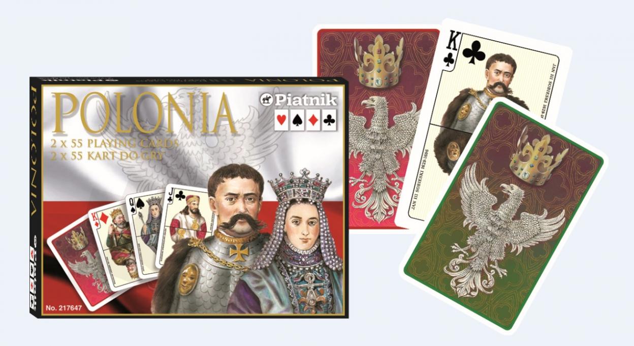 Karty wyprodukowane na specjalne życzenie polskich odbiorców. Eleganckie pudełko zawiera dwie talie z wizerunkiem Orłów Piastowskich w koronie na rewersach (koszulkach). Awersy (twarze) pochodzą z Pocztu Królów Polskich Matejki.