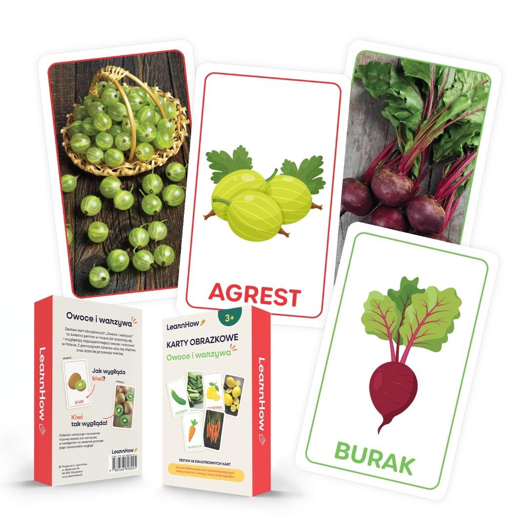 Zestaw zawiera aż 45 kolorowych, dwustronnych kart z nazwami owoców i warzyw oraz ich fotografiami!
