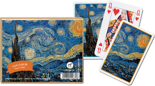 Najwyższej jakości karty do gry renomowanej firmy Ferd. Piatnik & Sohne. W komplecie 2 talie w eleganckim, złoconym pudełku z charakterystyczną Piatnikowską poduszeczką, a całość w oprawie słynnego obrazu "Gwiaździsta noc" Vincenta van Gogha. Talie składają się z 55 plastikowanych kart o wymiarach 58 x 89 mm i gramaturze 310. Idealne zarówno do brydża, pokera, remika jak i innych gier. Wyroby wiedeńskiej fabryki Ferd. Piatnik & Sohne od 1824 roku urzekają bogactwem wzorów i perfekcją wykonania. Jakość i tradycja!