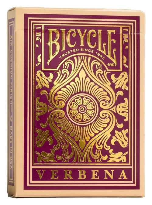 Talia kart VERBENA inspirowana dzikim kwiatem werbeny, co dobitnie ma swoje odzwierciedlenie w rewersach kart, które ozdobione są wzorem ze skomplikowanymi liniami łodyg i kwiatów, często widzianymi w odcieniach głębokiego fioletu. Wszystkie elementy tali posiadają unikalną kolorystykę oraz grafikę, obejmuje to figury, rewers i pudełko. Piękne złote wykończenia z folii Hot Stamp na opakowaniu nadają jej luksusowy i bardzo klasyczny sznyt. Marka Bicycle® to najbardziej popularne karty na świecie z Tradycją sięgającą 1885 roku! Talia składa się z 55 kart w rozmiarze 63 × 89 mm, pakowane w pudełko. Karty posiadają standardowe indeksy na przeciwległych narożnikach kart. Karty wyprodukowano z dedykowanego kartonu Bicycle – gwarantującego niespotykaną sztywność, powlekane posiadają specjalne wykończenie Air Cushion Finish, dzięki któremu jedwabiście gładko przesuwają się, zapewniając łatwe tasowanie i optymalną pracę. Karty idealne zarówno do pokera, sztuczek magicznych, jak i klasycznych gier karcianych. Dotknij ich i przekonaj się, dlaczego kocha je cały świat!