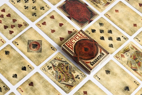 BICYCLE® VINTAGE - Przedstawiamy klasyczne karty do gry w stylu vintage! Ta talia kart wygląda tak, jakby była zamknięta przez prawie sto lat, w kapsule czasu czekając, aż ktoś przyjdzie i ponownie ją odkryje. Misterna grafika na pudełku pięknie się postarzała, ale czerwień zachowała swój żywy i intensywny kolor przez lata. Ta zjawiskowo piękna talia składa się 54 stylizowanych kart w unikalnej grafice. Marka Bicycle® to najbardziej popularne karty na świecie z Tradycją sięgającą 1885 r! Standardowe indeksy na przeciwległych narożnikach kart. 55 kart w talii w rozmiarze 63 x 89 mm, pakowa nich w pudełko. Karty powlekane , posiadają specjalne wykończenie Air Cushion Finish. Karty idealne zarówno do pokera, trików magicznych jak i pozostałych gier.