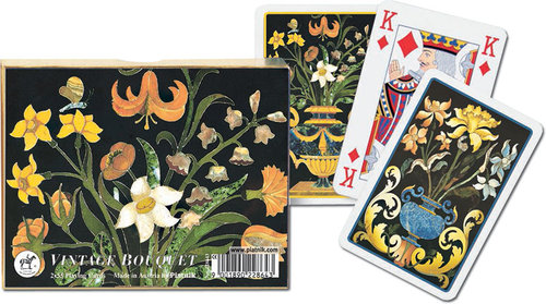 W komplecie z serii "Florentine Mosaic" 2 talie w eleganckim, złoconym pudełku z charakterystyczną Piatnikowską poduszeczką. Na rewersach (koszulkach) i na pudełku szlachetne wzory. Talie składają się z 55 plastikowanych kart o wymiarach 58 x 89 mm i gramaturze 310. Idealne zarówno do brydża, pokera, remika jak i innych gier.