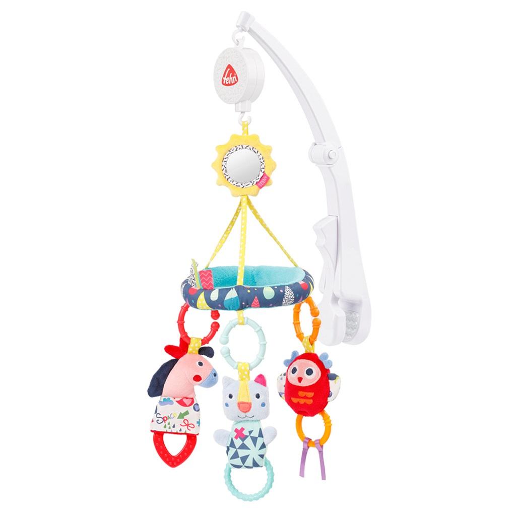 Zabawka oferuje wszystko co sprawia, że serca małych odkrywców biją szybciej. Różnorodność kolorów i materiałowa mieszanka miękkiego weluru, frotte i bouclette, zapraszają do dotykania i głaskania. Kształt, kolory i bezpieczne lusterko szczególnie pobudzają ciekawość. Mechaniczna pozytywka pozwala postaciom tańczyć i łagodnie uspokaja w rytmie popularnej kołysanki. Specjalnie zaszyte końcówki zachęcają do gryzienia, ssania, targania i ściskania. W małym, bezpiecznym lusterku można się przeglądać. Gryzaczek łagodzi ból podczas fazy ząbkowania dziecka. Karuzelę bezpiecznie mocujemy do fotelika dziecięcego, wózka, kojca i łóżeczka. Szybko staje się więc wiernym towarzyszem w domu i w podróży zawsze zapewniając dobry nastrój!Zabawka wykonana z wielu, miłych w dotyku, materiałów.W ciągu dnia pierścień z figurkami można zdjąć do zabawy.Wzbudza ciekawość i stymuluje percepcję dziecka.Pozytywka łagodnie uspokaja dziecko przed snem.Ręcznie nakręcana pozytywka nie wymaga stosowania baterii.Gryzaczek łagodzi ból podczas ząbkowania.Grzechotka, piszczałka, szeleszczący papier i bezpieczne lusterko, wyzwalają chęć zabawy.Łatwa w montażu.Można prać w temp. 30C., po odłączeniu od mechanizmu pozytywki.Wymiary produktu: 45 cm x 17 cm 17 cm.Wszystkie zabawki niemieckiej marki FEHN są bezpieczne dla dzieci od 0 lat.Wykonane są z najlepszej jakości materiałów.Spełniają normy EN71, CE, badane w instytutach Stiftung Warentest lub kotest.