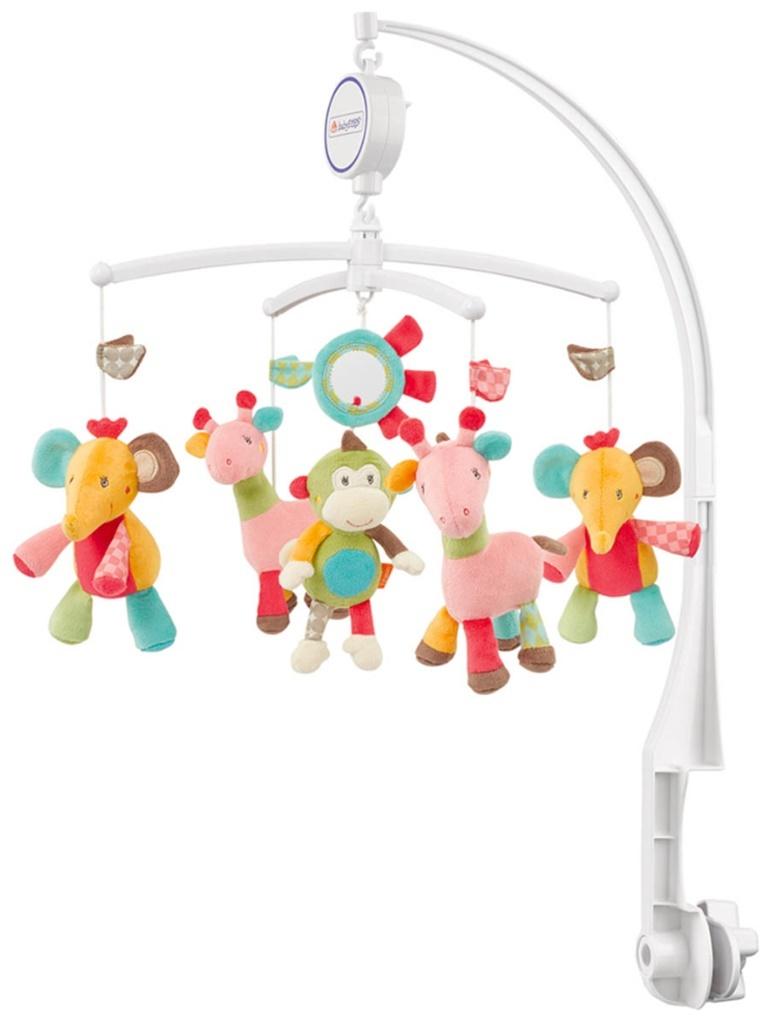 Karuzela z pozytywką z kolekcji: Safari. Urocza małpka, dwie figlarne żyrafy i dwa zadumane kolorowe słonie zabiorą Twojego maluszka do krainy snów. Mechaniczna pozytywka z włącznikiem/wyłącznikiem/ pozwala postaciom tańczyć i łagodnie uspokajać w rytmie popularnej kołysanki.W ciągu dnia bezpieczne lusterko i tańczące postacie budzą ciekawość i zapraszają do słuchania, oglądania i podziwiania. Delikatne kolory i różnorodne powierzchnie stymulują percepcję dziecka. Figurki łatwo można odczepić od dwóch kolorowych wieszaków w barwach tęczy i wykorzystywać do samodzielnej zabawy. Uchwyt karuzeli umożliwia łatwe mocowanie. W ten sposób karuzela z pozytywką szybko staje się niezbędna na łóżeczku Twojego maluszka. Karuzela wyposażona jest w miłe w dotyku, łatwo odpinane zabawki, lusterko i pozytywkę. Wzbudza ciekawość i stymuluje percepcję dziecka. Delikatne dźwięki pozytywki wyciszają i usypiają maluszka. Ręcznie nakręcana pozytywka nie wymaga stosowania baterii. Łatwa w montażu. Można prać. Wszystkie zabawki niemieckiej marki FEHN są bezpieczne dla dzieci od 0 lat. Wykonane są z najlepszej jakości materiałów. Spełniają normy EN71, CE, badane w instytutach ""Stiftung Warentest"" lub ""kotest.