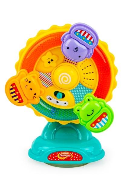 Zakręć kołem karuzeli i włącz się do zabawy! Karuzelka kryje w sobie odgłosy zwierząt, melodie i migające światełka, a dzięki praktycznej przyssawce, można ją przymocować do płaskiej, czystej i gładkiej powierzchni, aby nie przesuwała się w trakcie zabawy. Po naciśnięciu na każde ze zwierzątek, maluch usłyszy jego odgłos oraz melodię. Funkcja regulacji głośności umożliwia dostosowanie zabawki do indywidualnych potrzeb.