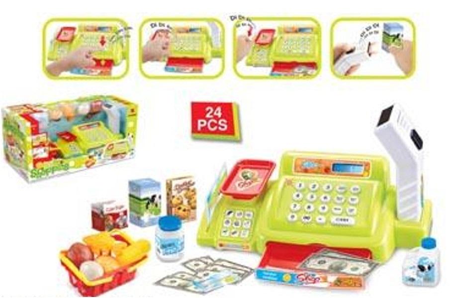 Kolorowa kasa sklepowa ze skanerem i z akcesoriami (pieniędzmi). Do zestawu dołączono także koszyk zakupowy z artykułami spożywczymi. Szuflada kasy otwiera się za pomocą przycisku na kasie. Skaner świeci kolorowym światełkiem i wydaje dźwięki. Łącznie zestaw zawiera 24 części. Produkt działa na baterie typu AA. Baterie nie znajdują się w zabawce. Zabawka przeznaczona dla dzieci powyżej 3 roku życia. Produkt zapakowany w kartonowe opakowanie z okienkiem