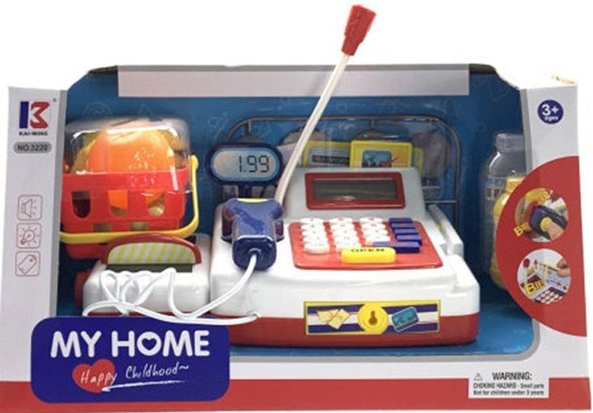 Plastikowa kasa sklepowa ze skanerem i z akcesoriami (pieniędzmi). Do zestawu dołączono także koszyk zakupowy z artykułami spożywczymi. Szuflada kasy otwiera się za pomocą przycisku na kasie. Produkt posiada także przesuwaną taśmę na produkty. Skaner świeci kolorowym światełkiem i wydaje dźwięki. Produkt działa na baterie typu AA. Baterie nie znajdują się w zabawce. Zabawka przeznaczona dla dzieci powyżej 3 roku życia. Produkt zapakowany w kartonowe opakowanie z okienkiem