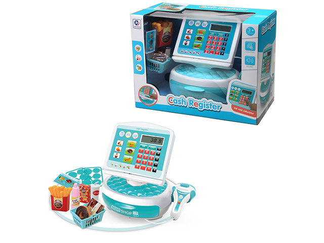 Kasa sklepowa dotykowa z czytnikiem kodów i kalkulatorem. W zestawie także koszyk na zakupy i artykuły spożywcze oraz monety i karta płatnicza.