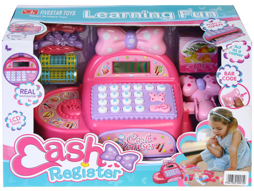Kasa plastikowa ze światłem i dźwiękiem, w kolorze różowym z ozdobnymi kokardami. W zestawie pieniądze do transakcji kupno-sprzedaż, akcesoria do sprzedawania oraz akcesoria do stylizacji włosów.