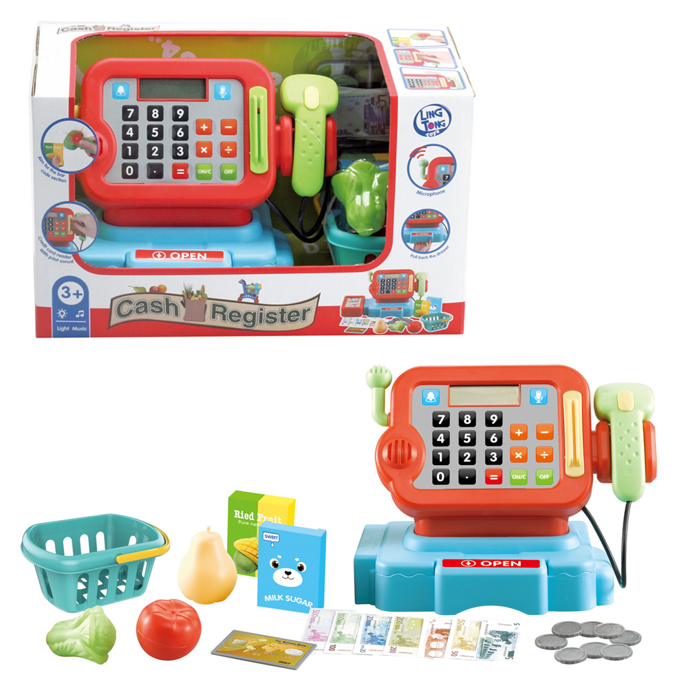 Kasa sklepowa ze skanerem i wagą, koszykiem zakupowym, zakupami oraz pieniędzmi. Wymagane baterie - 2xAA (niedołączone) Wymiary opakowania: 33 x 16 x 20 cm
