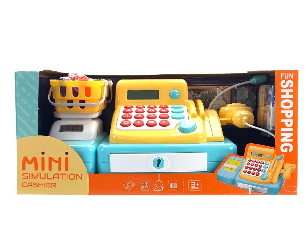 Kasa z wagą, czytnikiem i mikrofonem. W zestawie również koszyk z zakupami. Kasa na baterie - 2xAA (niedołączone). Wymiary opakowania: 38.5 x 19 x 17 cm