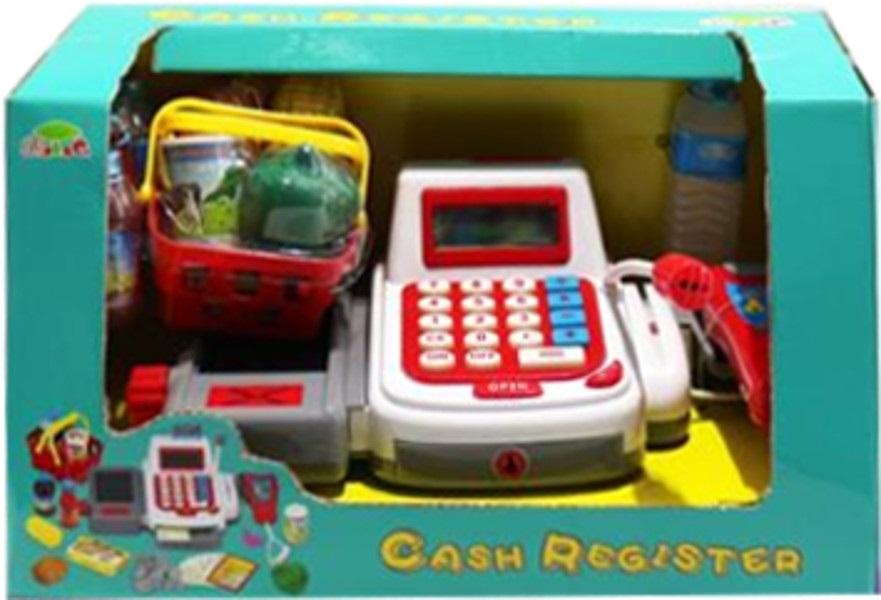 Plastikowa kasa sklepowa ze skanerem i z akcesoriami (pieniędzmi). Do zestawu dołączono także koszyk zakupowy z artykułami spożywczymi. Szuflada kasy otwiera się za pomocą przycisku na kasie. Produkt posiada także przesuwaną taśmę na produkty, która świeci światełkiem. Skaner również świeci kolorowym światełkiem. Produkt działa na baterie typu AA. Baterie nie znajdują się w zabawce. Zabawka przeznaczona dla dzieci powyżej 3 roku życia. Produkt zapakowany w kartonowe opakowanie z okienkiem