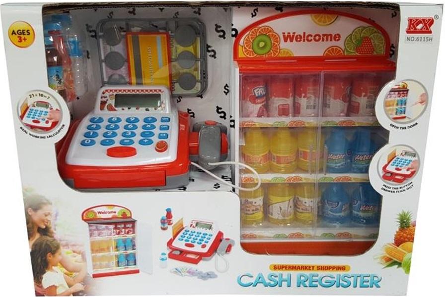 Plastikowa kasa sklepowa ze skanerem i z akcesoriami (pieniędzmi). Szuflada otwiera się za pomoca przycisku na kasie. Skaner świeci kolorowym światełkiem. Produkt posiada także czytnik kart kredytowych i działający kalkulator. Ponad to w zestawie dołączono także otwieraną lodówkę z napojami, które również można skanować. Produkt działa na baterie typu AA. Baterie nie znajdują się w zabawce. Zabawka przeznaczona dla dzieci powyżej 3 roku życia. Produkt zapakowany w kartonowe opakowanie z oki