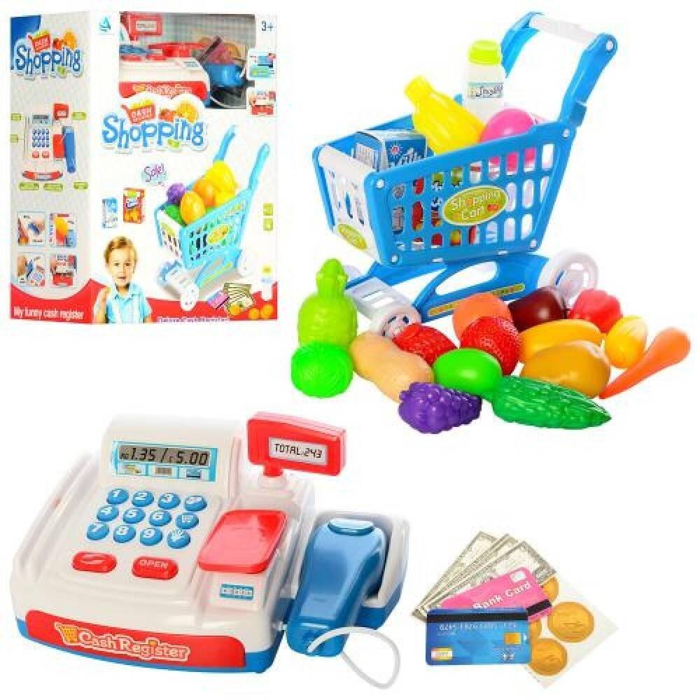 Zabawka z efektami dźwiękowymi na baterie. Otwieraną szufladą na pieniądze. W zestawie wózek sklepowy z owocami, produkty spożywcze do kasowania.