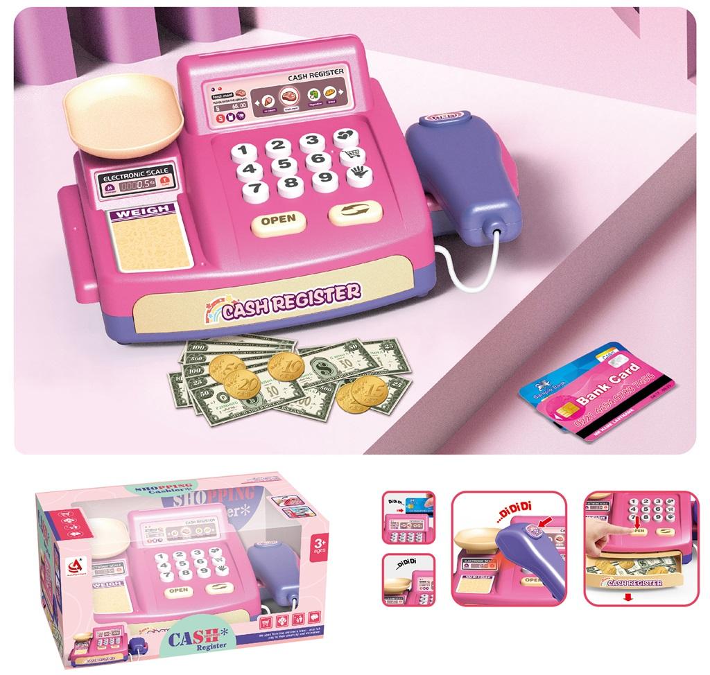 Kasa na baterie z dźwiękiem, z imitacją wagi oraz czytnika kodów kreskowych.