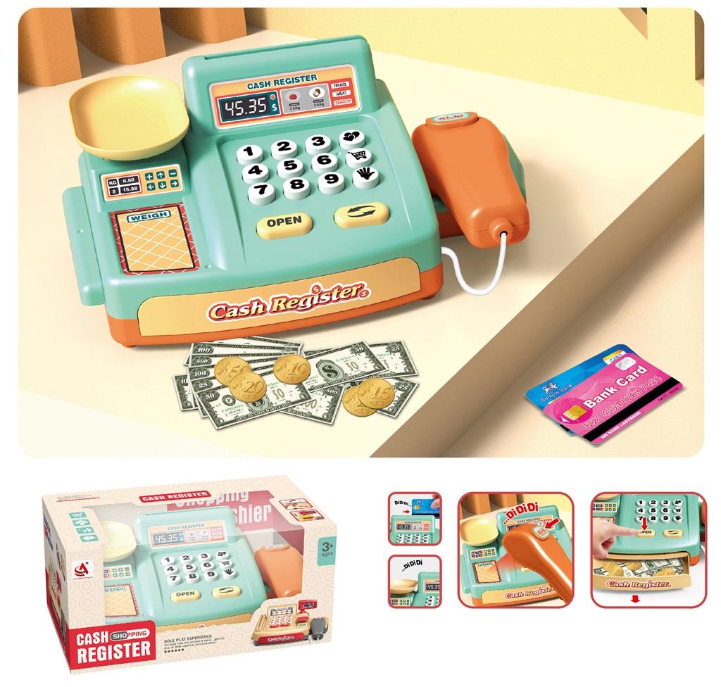 Kasa na baterie z dźwiękiem, z imitacją wagi oraz czytnika kodów kreskowych.