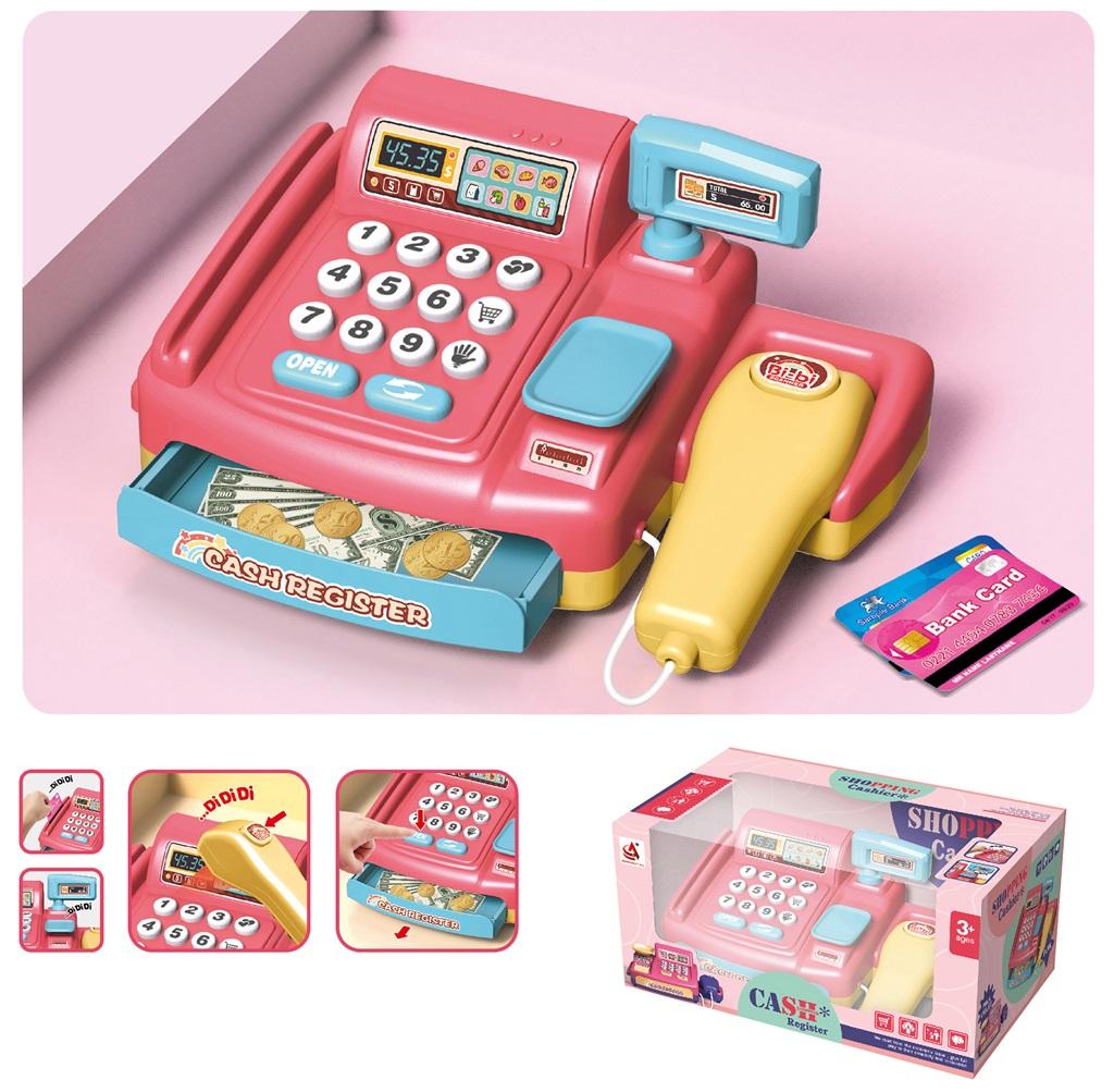 Kasa na baterie z dźwiękiem, z imitacją wagi oraz czytnika kodów kreskowych.